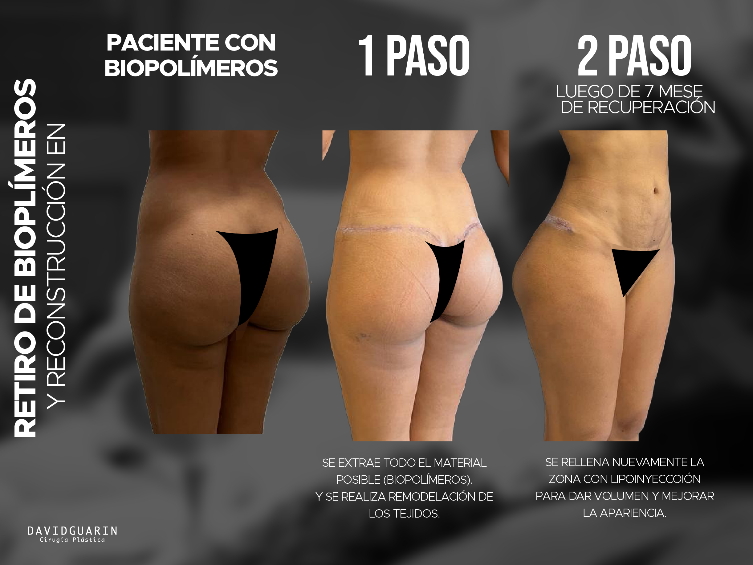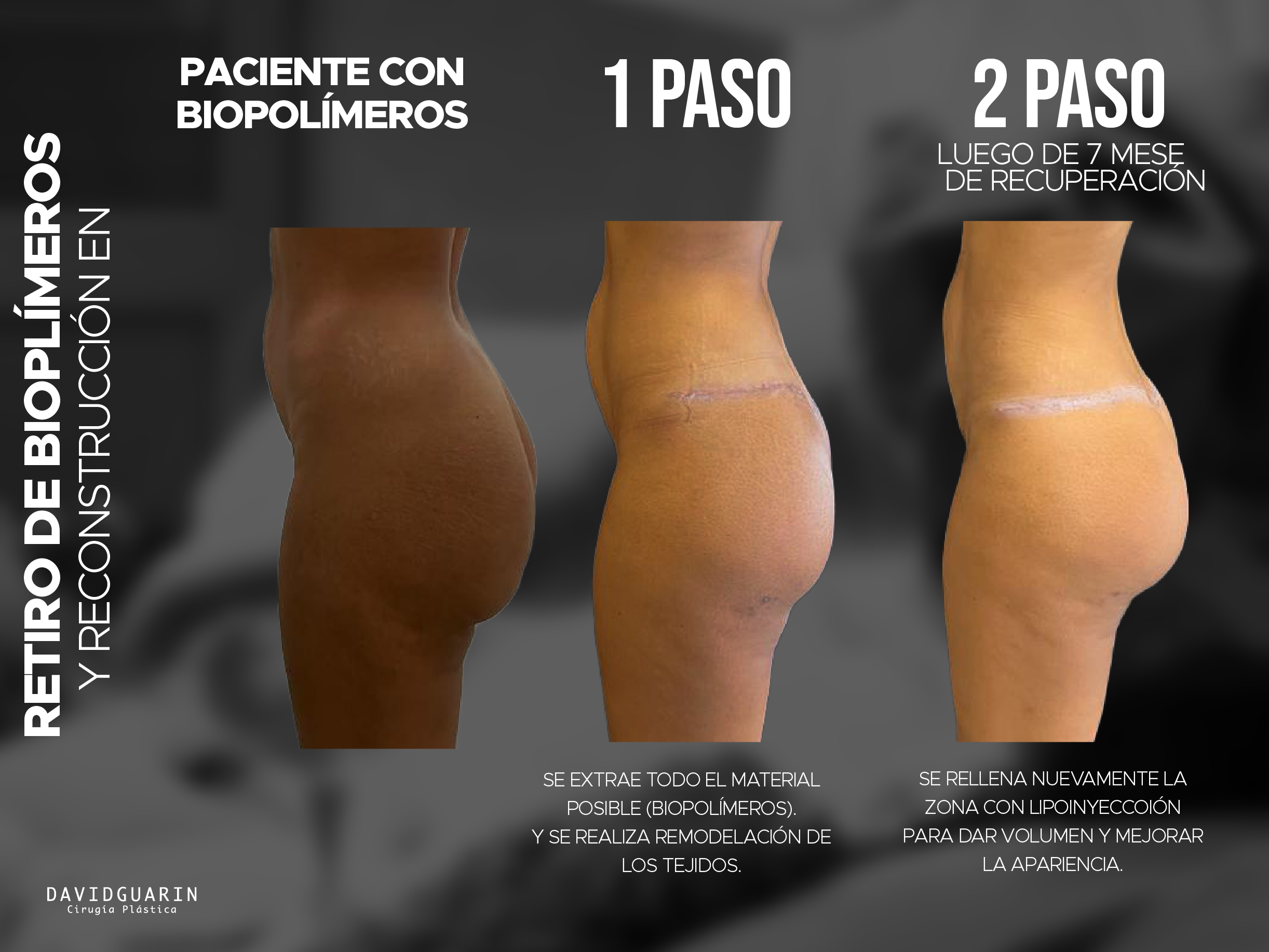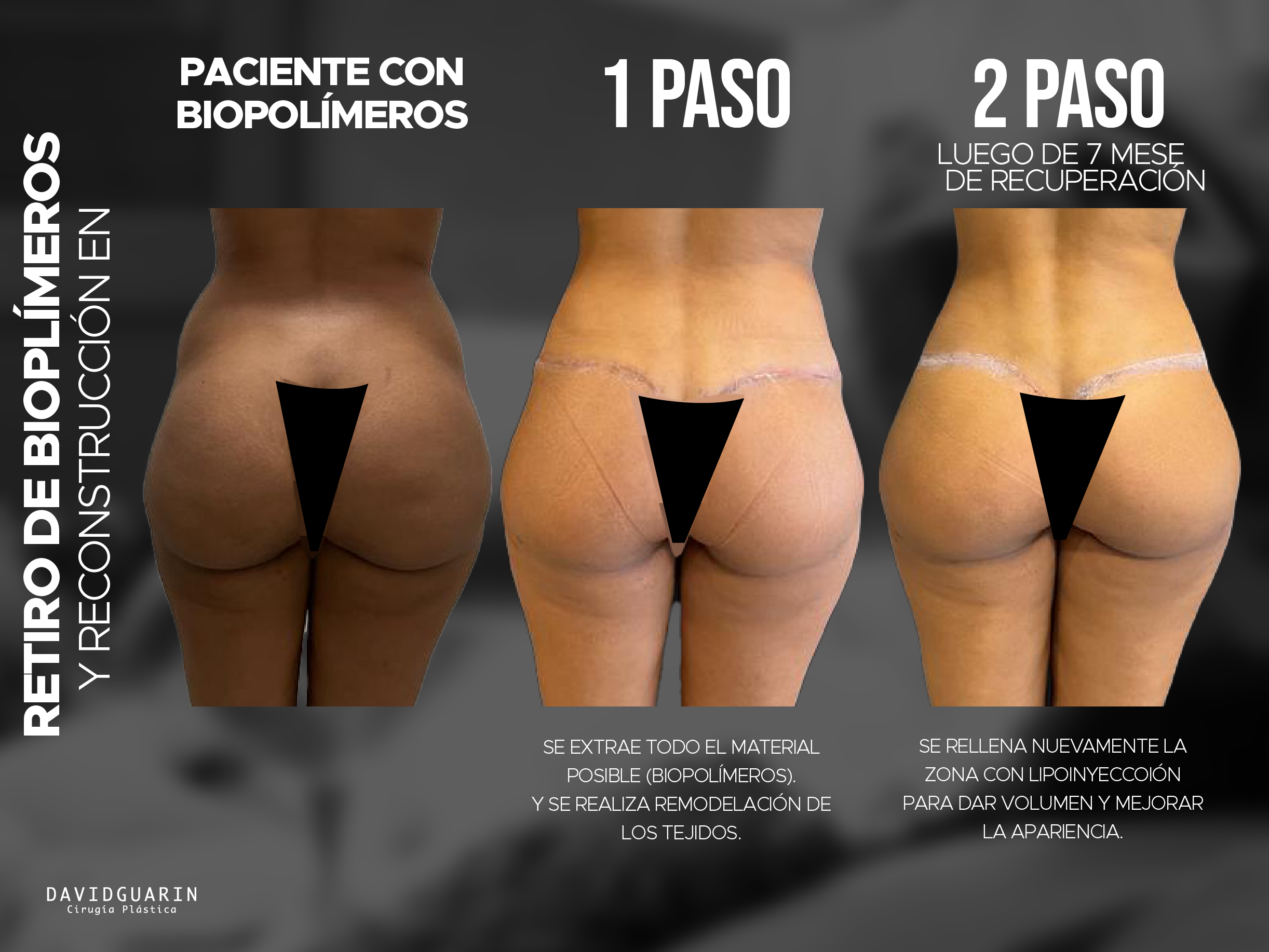 La reconstrucción es el procedimiento estético mas importante para la paciente que se realiza una extracción de biopolímeros; los daños y consecuencias de la presencia de estos materiales en el cuerpo pueden incluir: perdida de tejido, asimetrías, irregularidades en la piel y secuelas de biomaterial; Hacer una evaluación profesional sobre el caso y escoger la mejor técnica quirúrgica es el inicio de un procedimiento exitoso.